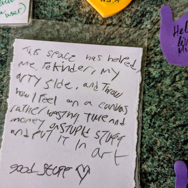 On weeks where we don't run structured workshops our doodle boards are rolled out onto tables. They offer our community a relaxed space that puts people at ease and gives them the freedom to doodle on the long canvas as they sit and speak within the group. Our doodle boards have been around a while now. We hope to finish them soon.